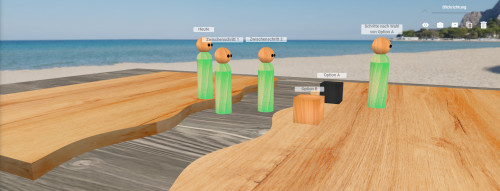 Durch die Möglichkeit, im Coachingspace die Blickrichtung anzupassen und die Innenperspektive einzelner Figuren einzunehmen, lässt sich das „vom Ende her denken“ spielend leicht umsetzen (siehe Screenshot 2). Im Online-Setting braucht es dafür manchmal etwas mehr Zeit als in Präsenz, um das auf sich wirken zu lassen. Da ist etwas Geduld gefragt. Danach schreiten wir auch im Online-Setting die digitale Timeline von hinten ab und legen wiederum Klötze als Maßnahmen bzw. Schritte, die die Medianden bis zum „Punkt des Schmunzelns“ unternommen haben (zwei Klötze sind von vorne herein beim bunten Figurenset vorhanden; über die Duplizieren-Funktion lassen sich weitere erstellen).