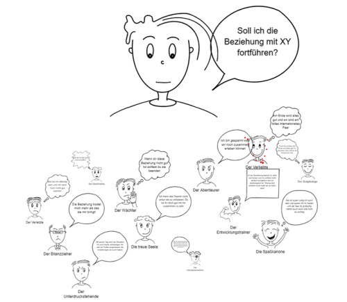 Das Bild zeigt ein Beispiel eines solchen Selbstcoaching-Ansatzes, bei dem ein Klient versucht hat, seine inneren Anteile im Hinblick auf eine Beziehungssituation zu visualisieren: