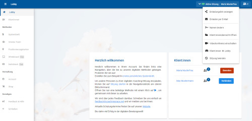 Dank der vielen Rückmeldungen aus der Community haben wir uns in den letzten Wochen insbesondere mit dem Prozess des Verbindens mit euren Klientinnen und Klienten und der Prozesssteuerung beschäftigt und hier einige Verbesserungen eingebaut. Vor dem Verbinden betreten eure Klientinnen und Klienten zunächst den Warteraum inklusive Technik-Check. Danach können Sie die Lobby und ihr als Coaches erhaltet eine Info darüber, dass sich nun jemand in eurer Lobby befindet. Zudem habt ihr die Möglichkeit, alleine auf Methoden zu springen und eure Klientinnen und Klienten im Nachgang nachholen.